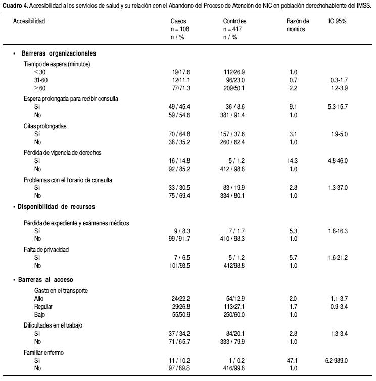 La media del tiempo de envío de la paciente a la consulta externa de especialidad fue de 29 días con una mediana de 13. El tiempo promedio de espera para recibir consulta fue de una hora con 37 minutos, moda de dos horas y un intervalo de cinco minutos hasta cinco horas. Las pacientes consideraron que tanto el tiempo de espera para recibir consulta como el de citas subsecuentes eran prolongados, ambas significativas en el análisis (OR = 8.8; 5.115.1 y OR = 3.0; 1.94.9). Asimismo, pacientes que refirieron problemas en mantener la vigencia a recibir atención médica institucional tuvieron mayores probabilidades de abandono (OR = 14.3). El 30.5% de los casos refirió incompatibilidad con el horario para asistir a consulta en relación con 19.9% de los controles (OR = 1.8). La falta de expediente o de los estudios médicos de seguimiento, así como la percepción de la falta de privacidad en la consulta médica, fueron condiciones que igualmente tuvieron una asociación con abandono (Cuadro 4).