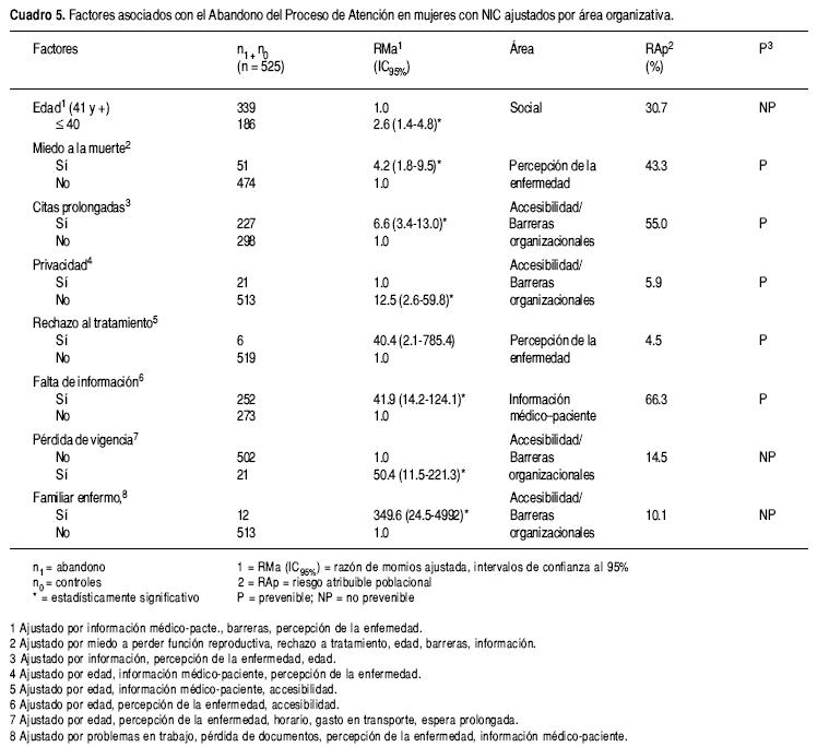 Se obtuvieron los factores de riesgo ajustados con mayor relevancia en el abandono del tratamiento de las pacientes con NIC. Entre ellas destacan el rechazo al tratamiento (ORa = 40.4; 2.1785); la falta de información del médico hacia la paciente (ORa = 41.9; 14.2124.1); la pérdida de vigencia a los servicios médicos institucionales (ORa = 50.4; 11.5221.3) y que la paciente hubiera tenido a su cargo un familiar enfermo (ORa = 349.6; 24.54992). El cálculo de los riesgos atribuibles de mayor importancia fueron el miedo a la muerte (RAp = 43.3%), las citas prolongadas (RAp = 55.0%) y la falta de información del médico hacia la paciente (RAp = 66.0%) (Cuadro 5).