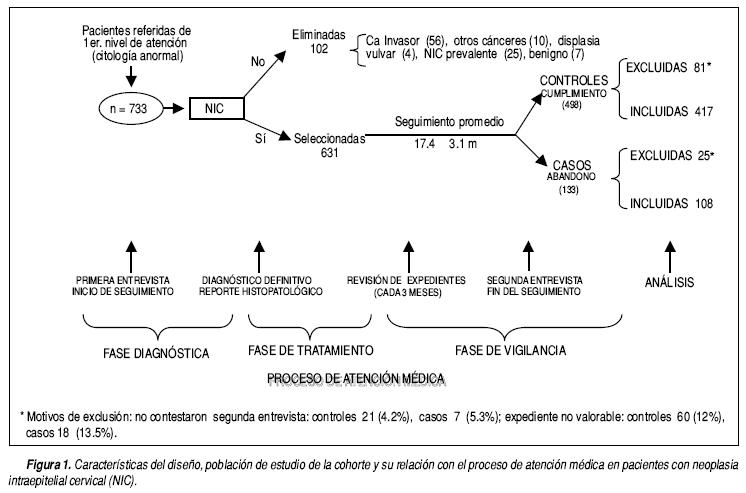 El proceso de atención médica para las pacientes con NIC comprende desde la detección a través de la citología cervical hasta la fase de contrarreferencia y rehabilitación. El abandono en el concepto manejado en este trabajo no evaluó el inicio del proceso, ya que la población estudiada fue captada en las clínicas de especialidad de referencia y es posible que un grupo de pacientes que tuvieron un resultado anormal en la citología realizada en unidades médicas de primer nivel no llegaran a demandar el servicio de especialidad, lo que puede ser un factor que subestime la frecuencia de abandono.
