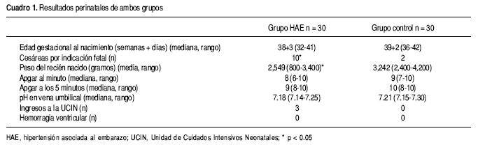Los resultados perinatales de ambos grupos se muestran en el cuadro 1. No hubo diferencia en la edad gestacional al nacimiento entre ambos grupos. El grupo HAE presentó un mayor número de cesáreas por indicación fetal (p = 0.05), un menor peso al nacimiento (p = 0.02) y un mayor número de ingresos a la unidad de cuidados intensivos neonatales.