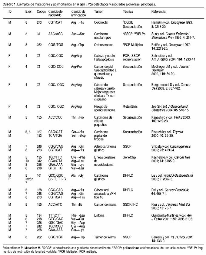 Leu).56 En la figura 3 se muestra un ejemplo de una imagen obtenida de la hibridación múltiple de una muestra problema utilizada en este microarreglo. En general en la literatura existen datos sobre el valor clínico que representan la identificación tanto de mutaciones como de polimorfismos en TP53, algunos ejemplos se incluyen en el cuadro 1.