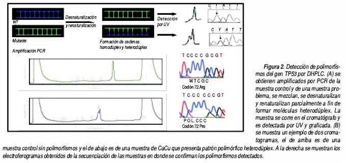 La tecnología de DHPLC es un método de tamizaje muy utilizado debido a su bajo costo, alta sensibilidad y eficiencia. Se basa en una separación por cromatografía líquida en fase reversa de las cadenas de DNA en una muestra biológica, en donde se realiza la desnaturalización parcial por calor. Para ello se hace PCR de dos muestras (una que corresponde a un control de secuencia silvestre, previamente conocida, y otra de una muestra problema). La mezcla de los productos de PCR de ambas muestras, se somete a un cambio de temperatura, facilitando la renaturalización de las cadenas de DNA. Posteriormente, esta mezcla se inyecta en el cromatógrafo en donde las moléculas de DNA son eluidas y su detección se realiza a través de un detector ultravioleta, el cual permite que los fragmentos de DNA sean registrados. Por lo cual, un patrón cromatográfico con un solo pico de elusion significa que la muestra problema es 100% complementaria a la muestra control y más de un pico de elusion significa que existe al menos un cambio de nucleótido de la muestra problema respecto a la muestra control. Las principales ventajas de este método son: simplicidad, bajo costo en el total del experimento, alta tasa de detección (95100%).41 Además, es posible hacer la detección en fragmentos que van desde 200 nucleótidos hasta más de una kilobase.51 Finalmente, sólo las muestras con patrones cromatográficos alterados son secuenciadas para determinar los cambios presentes respecto al normal, evitando la secuenciación de todas las muestras estudiadas. En la figura 2 se muestra un ejemplo de un análisis de TP53 por DHPLC, en donde se pueden observar los patrones cromatográficos de un caso homocigoto con secuencia silvestre y un caso polimórfico en estado heterocigoto, dichos casos fueron confirmados por secuenciación. Con la metodología de DHPLC estamos realizando un estudio de los polimorfismos de TP53 en muestras de sangre periférica de pacientes con cáncer cérvico uterino (CaCu), en colaboración con el INCAN, SS. Hasta el momento hemos detectado que 57% de los controles y 38% de mujeres afectadas por CaCu presentan una secuencia homologa en 100% a la secuencia silvestre de referencia del exón 4 (tamaño del fragmento: 363 pb) de TP53 (# de acceso: U94788). A la fecha, se han analizado más de 23,000 nucleótidos para determinar todos aquellos polimorfismos presentes en el exón 4 de este gen.