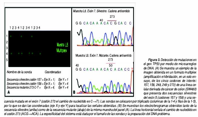 Por otra parte, la caracterización de polimorfismos tiene gran relevancia para identificar a la población con predisposición o riesgo asociada a enfermedades como el cáncer. Es importante resaltar que más de 70% de los estudios moleculares se han enfocado en la región central del gen TP53, específicamente en los exones 58, los cuales codifican para el dominio de enlace al DNA.15 Por lo tanto, es esencial que las pruebas clínicas estén dirigidas específicamente a establecer el efecto de las mutaciones en TP53 y su asociación con el tipo de cáncer.30'34'37 La técnica de DHPLC ofrece varias ventajas: gran rendimiento, bajo costo, alta sensibilidad, detección de muestras con diversas variaciones genéticas previamente conocidas o desconocidas, por lo cual es una poderosa herramienta que puede aplicarse a gran escala y la cual es accesible en nuestro medio. En relación con los microarreglos de DNA, la aproximación más importante es el "p53 GeneChip de Affymetrix" utilizado para identificar mutaciones en este gen.54,57,58 Sin embargo, por el costo y la poca disponibilidad para muchos investigadores, resulta necesario desarrollar métodos de detección accesibles, específicos, reproducibles y de bajo costo para la detección de variaciones genéticas, como las que se han presentado aquí. Una de las ventajas de la estrategia utilizada fue el diseño del tamaño de las sondas (siete nucleótidos) que pueden discriminar variaciones genéticas, debido al efecto desestabilizante de los nucleótidos mal apareados en la sonda blanco, con respecto a las sondas (de 25 a 30 nucleótidos) utilizadas en la mayoría de los arreglos comerciales.59 En resumen, con estas dos tecnologías se pueden estudiar las variaciones genéticas en este gen con una alta sensibilidad y especificidad de las mismas. El uso de estas herramientas puede ser aplicado al estudio de mutaciones o polimorfismos en una patología en particular.