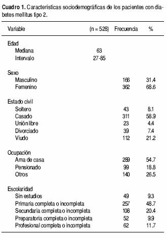 Se reclutaron 528 pacientes con DM2. Como se observa en el cuadro 1 la mediana de edad fue de 63 años, con intervalo de 27 a 85 años. Dos terceras partes de la muestra fueron mujeres y más de la mitad de los pacientes estuvieron casados. Más de la mitad de los pacientes fueron amas de casa y 48.7% tuvo una escolaridad de primaria completa o menos.