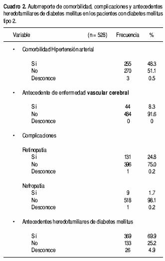El cuadro 2 muestra la frecuencia con que los pacientes refirieron comorbilidad y datos compatibles con retinopatía y nefropatía diabética. Aproximadamente la mitad de éstos tenía hipertensión arterial. La complicación más frecuente de la DM2 fue la retinopatía, la cual estuvo presente en aproximadamente 25% de los pacientes; 70% tuvo antecedentes heredofamiliares de DM2.