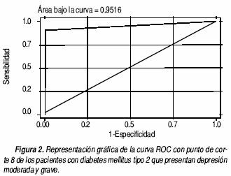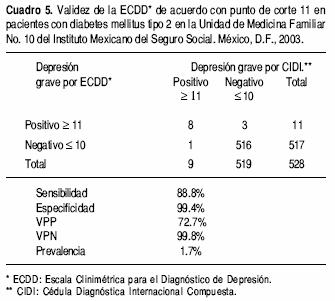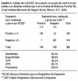 Patients and methods. The study was conducted on 528 DM2 patients in Family Medicine Unit No. 10 of the Instituto Mexicano del Seguro Social (Mexican Social Security Institute), during 2003. A diagnostic test design was employed, with the golden standard consisting of the composite international diagnostic interview. Samples were constructed around consecutive cases. Depression and its degrees were the dependent variables. Absolute and relative frequencies were calculated, along with the Kappa index, sensibility, specificity, positive predictive values (PPV) and negative predictive values (NPV) and ROC curves.