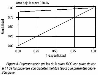 Pacientes y métodos. El estudio se llevó a cabo en 528 pacientes con DM2, en la Unidad de Medicina Familiar No. 10, del Instituto Mexicano del Seguro Social, durante 2003. Se utilizó un diseño de prueba diagnóstica, el estándar de oro fue la Cédula Diagnóstica Internacional Compuesta. El muestreo fue por casos consecutivos. La variable dependiente fue depresión y sus grados. Se calcularon frecuencias absolutas y relativas, índice Kappa, sensibilidad, especificidad, valores predictivos positivo (VPP) y negativo (VPN) y curvas ROC.