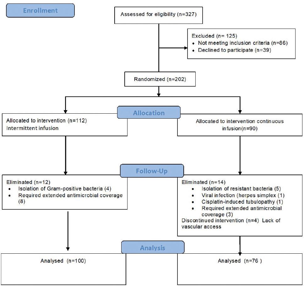 A non-blinded randomized controlled clinical trial was conducted in a third-level pediatric hospital. The eligible group was hemato-oncological pediatric patients (≤ 17 years old), were presented at the hospital with an event of FN, and was candidates to receive empirical antimicrobial treatment with TZP. FN was defined as a single oral temperature of ≥ 38.3°C, or a temperature of ≥ 38.0°C sustained over 1 h and an absolute neutrophil count (ANC) < 500 cells/mm3, or an ANC that is expected to decrease to < 500 cells/mm3 over the next 48 h. The study period included from April 2012 to August 2015. Exclusion criteria: Chemotherapy-associated nephrotoxicity, suspected intravascular device-associated infections, a recent event (< 1 month) of methicillin-resistant Staphylococcus aureus or Streptococcus pneumoniae invasive infection, history of allergic reaction to any β-lactam, a FN episode 30 days before present admission, patients with severe sepsis or septic shock, and those in palliative care were excluded from the study. Elimination criteria: Chemotherapy-associated nephrotoxicity during the hospital stay while receiving antimicrobial treatment, violations of the protocol, patients with fungal or viral infections as a cause of fever, those with isolation of Gram-positive cocci or multiresistant Gram-negative bacilli, patients with localized infections (pneumonia, neutropenic colitis, skin and soft tissue infection, and anal fissures/perianal abscesses) that lead to changes in the antimicrobial treatment in the first 72 h, and patients in the continuous infusion group in whom antibiotic infusion was suspended for more than 4 h.