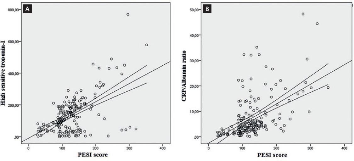 Figure 1 Graphs show the correlation between PESI score and (A) high-sensitivity troponin-I level. (B) CRP/albumin ratio.
