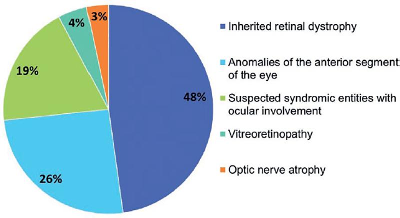 In 10 patients, the clinical diagnoses were changed based on their genetic findings: two cases diagnosed as macular dystrophy were correctly assigned as early-onset retinal dystrophy and cone-rod dystrophy type 12, respectively; one patient with Leber congenital amaurosis was correctly diagnosed as oculocutaneous albinism type 2; one case with a clinical diagnosis of cone-rod dystrophy received a definitive diagnosis of retinitis pigmentosa type 12; a patient with microphthalmia, anophthalmia, and coloboma spectrum was diagnosed with CHARGE (Coloboma, Heart anomaly, choanal Atresia, Retardation, and Genital and Ear anomalies) syndrome; a patient with a presumptive connective tissue disorder was definitively reassigned as Lhermitte-Duclos syndrome; one case with a diagnosis of Nance-Horan syndrome was correctly diagnosed as Noonan syndrome type 4; a case identified as Gillespie syndrome was definitively assigned as alacrima-achalasia-intellectual disability syndrome; one case of presumptive Axenfeld-Rieger syndrome received a conclusive diagnosis of Schuurs-Hoeijmakers syndrome; and a patient with congenital pulverulent cataract received a final diagnosis of hyperferritinemia cataract syndrome.