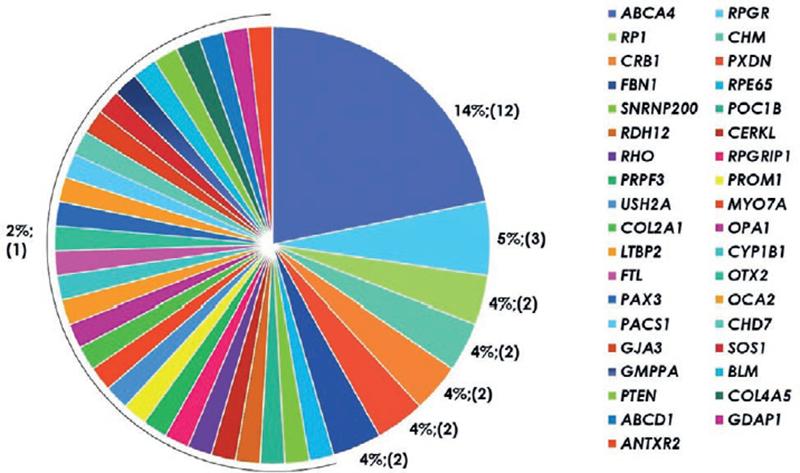 Genetic eye disorders, affecting around one in 1000 people worldwide15, encompass a clinically and genetically heterogeneous group of diseases that collectively involve every structure of the eye, ocular adnexa, and visual system16. Genetic eye disorders can occur at all ages and are frequently associated with severe visual deficiency. As per the World Health Organization, genetic eye disorders are one of the top 10 major causes of global ocular health burden17. It is estimated that up to 30% of the approximately 6000 Mendelian diseases in humans have some ocular involvement and thus there are hundreds of genes causing eye diseases when mutated18. Many inherited eye diseases have considerable genetic heterogeneity (i.e., multiple genetic causes), and therefore, the use of NGS allows a growing number of patients to obtain a molecular diagnosis for their disease19-22.