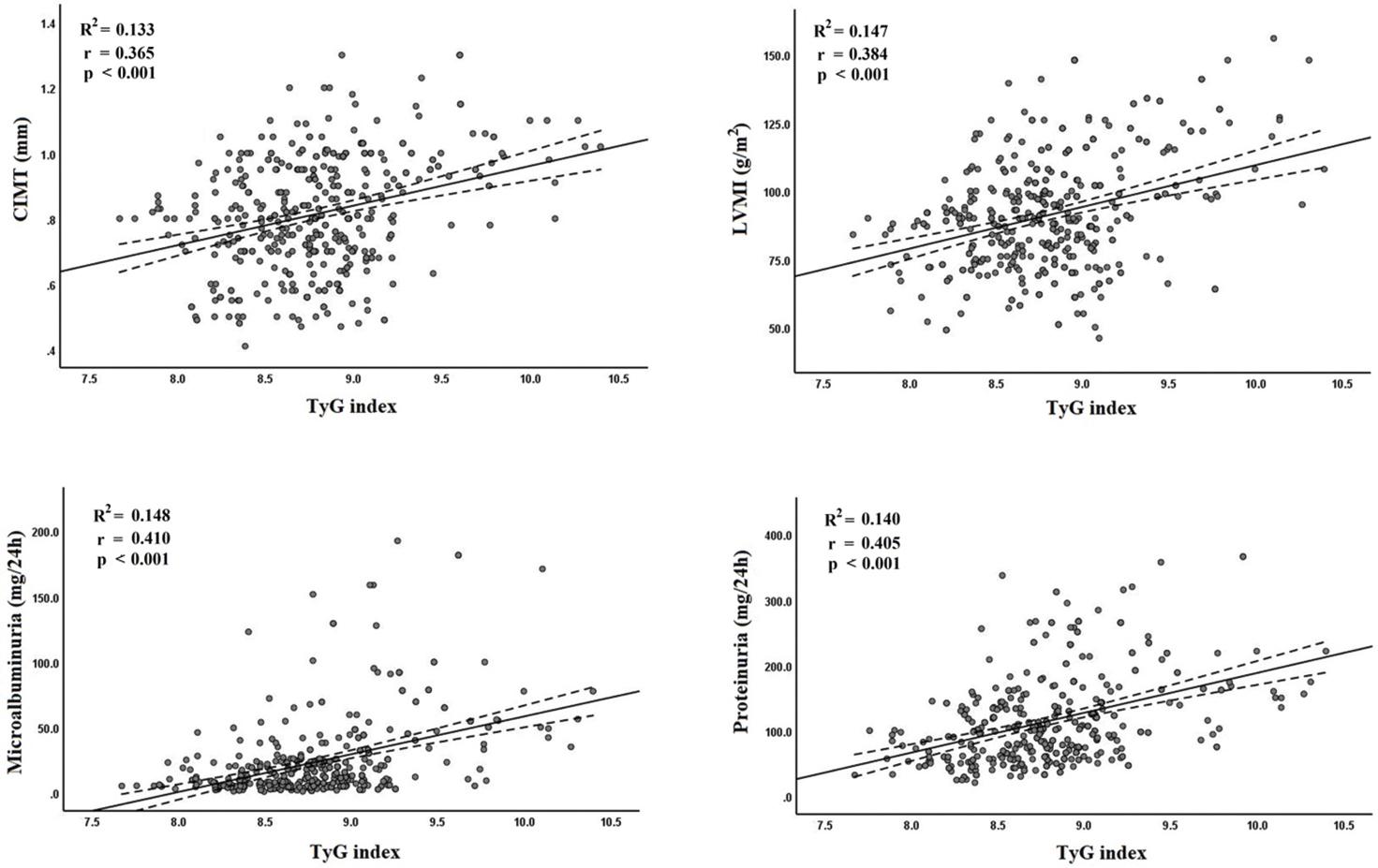 The hypertensive and normotensive groups, the majority of whom were female, had similar mean ages, BMIs, and rate of smoker. The levels of HMOD indicators and mean TyG index (9.0 ± 0.4 vs. 8.4 ± 0.4, p < 0.001) were higher in the hypertension group than the normotensive group. In both groups, there was a positive correlation between blood pressure levels and the TyG index, but it was stronger in the hypertensive group. In the hypertension group, TyG index was positively correlated with the levels of CIMT (r = 0.365; p < 0.001), and LVMI (r = 0.384; p < 0.001), and microalbuminuria (r = 0.410; p < 0.001), and proteinuria (r = 0.405; p < 0.001) (Fig. 2 and Table 1).