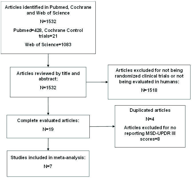Initially, 1532 articles were found with the keywords used (Fig. 2). After reviewing them by title and abstract, 1518 studies were excluded, most of them for not being clinical trials. Next, 19 studies were reviewed; 8 were excluded for not reporting MDS-UPDR III scores; and 4 were replicated. Finally, seven studies were selected for meta-analysis. These trials tested different immunomodulatory treatments: cinpanemab, prasinezumab (PRX 002), sargramostim (GM-CSF), PD03A, pioglitazone, minocycline, and GPI-1485. The baseline demographic and clinical characteristics of the patients are shown in table 1. In each study, the placebo groups were compared to the treatment groups. Subjects in all groups were patients with early-stage PD, with or without background treatment (levodopa, dopaminergic agonists or MAO-B inhibitors, or combinations).