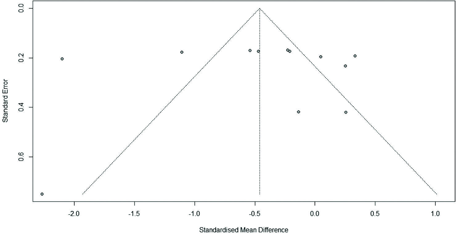 Regarding the quality of our meta-analysis, most of the included studies have a low risk of bias in the domains assessed by the Cochrane tool (Supplementary Fig. 1), suggesting a good methodological quality of the included studies. As for the sensitivity test, the omission of any study did not substantially change the magnitude or direction of the result (Fig. 4), so the result of the meta-analysis can be considered robust. With respect to publication bias, although the funnel plot shows some asymmetry in the included studies (Fig. 5), Egger´s test (Supplementary Fig. 2) showed no evidence of asymmetry. Thus, it can be assumed that there is no publication bias, although the small number of included studies should also be taken into account.