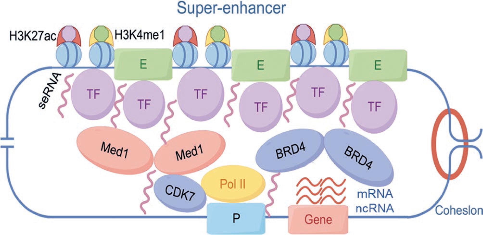 Figure 1. Structure and function of SEs. SEs orchestrate robust gene expression through the coalescence of transcription factors, coactivators (MED1 and BRD4), chromatin markers (H3K27ac and H3K4me1), and super-enhancer RNAs (seRNAs). These core SE components, in association with CDK7, Pol II, the cognate promoter, and the target gene locus, undergo liquid-liquid phase separation to establish a transcriptionally active biomolecular condensate. Within this spatially confined compartment, cooperative interactions among transcriptional machinery and chromatin elements synergistically amplify the efficiency of RNA polymerase II-mediated gene expression.