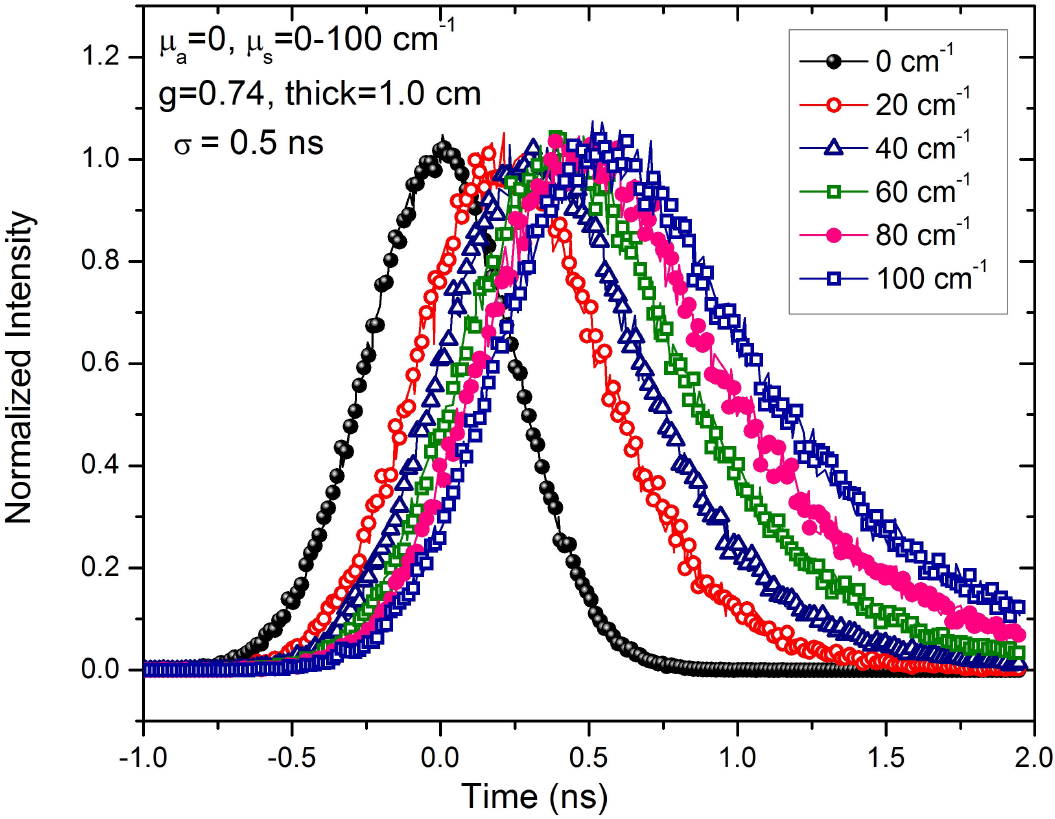 To better appreciate these effects, Fig. 4 shows the normalized intensity profiles resulting from the Monte Carlo simulations for a 0.5 ns incident laser pulse propagating through media with μs ranging from 1 to 100 cm-1. Values of μs larger than 100 cm-1 were tried, but we got a poor signal to noise ratio because of the lower amount of photons transmitted through the sample; therefore those results were not included in this report. As indicated above, increasing scattering coefficient produces a shift of the pulse peak to the right, and on top of that a distortion of the pulse profile was obtained in the form of a long tail at the late end of the pulse19. The reference pulse peak corresponding to propagation in a medium without scattering was centered to time zero and all other pulses appear shifted.
