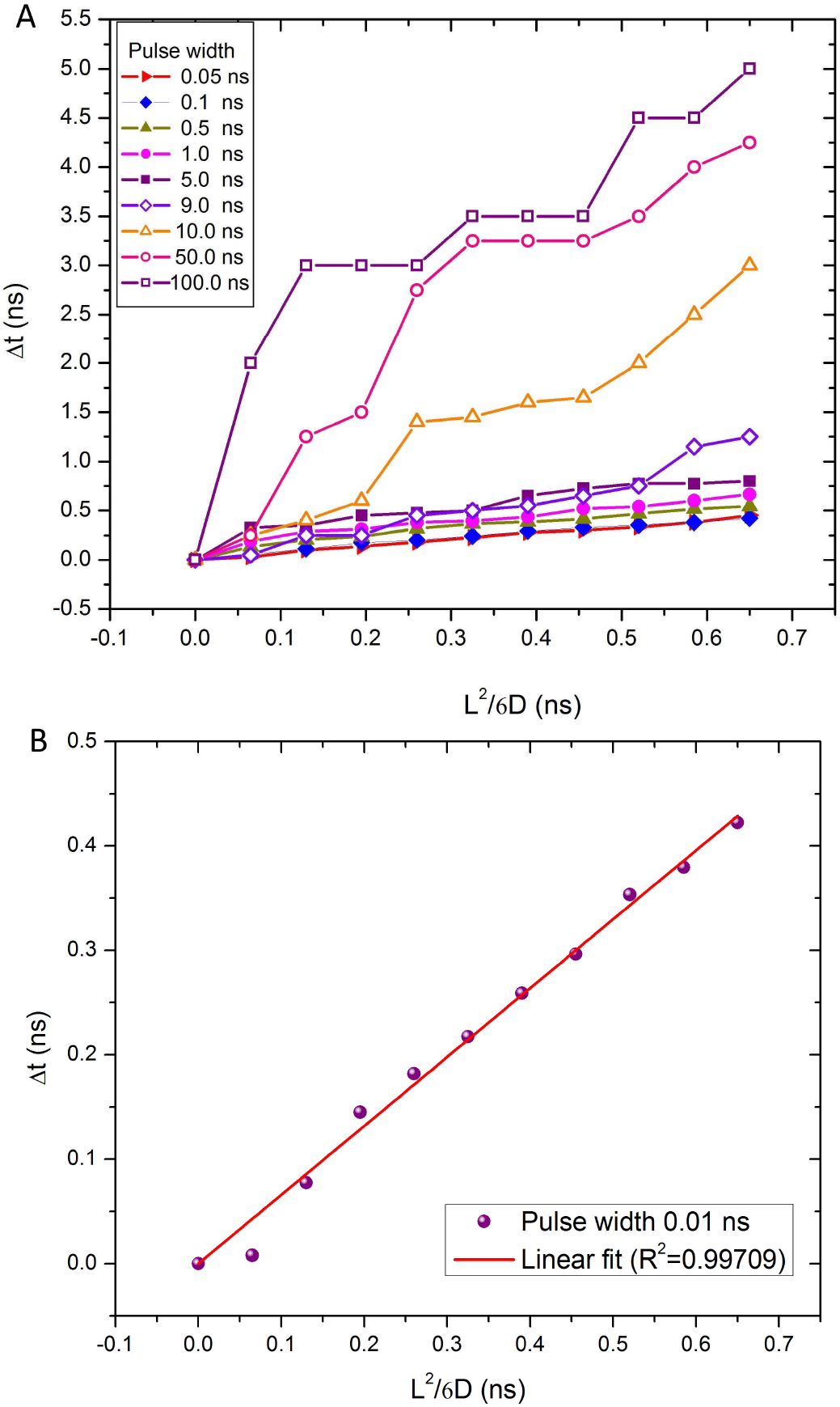 Several theoretical descriptions of the propagation of light in a turbid media are available21,22,23,24, however because of the limited range in which they apply for both pulse duration and optical properties, we still do not have an analytical theoretical description for the case of nanosecond pulse propagation in turbid media for a wide range of optical parameters. In particular, an approach similar to the work by Patterson et al12 is not possible here, due to the impossibility of analytically solving the diffusion approximation case using the correct initial condition. Nevertheless, a qualitative analysis is possible indeed by using the diffusion approximation, which treats light propagation through a turbid media at scales larger than the diffusive free path as a random walk, with a description similar to the random motion of Brownian particles in a viscous fluid11,12. Under such description, a photon diffuses inside the sample with some defined probabilistic rules. In particular, the mean squared free path of a photon is proportional to the diffusion coefficient and it is linear in time25. Thus, the mean time Δt required for a photon to travel a distance L, is proportional to L