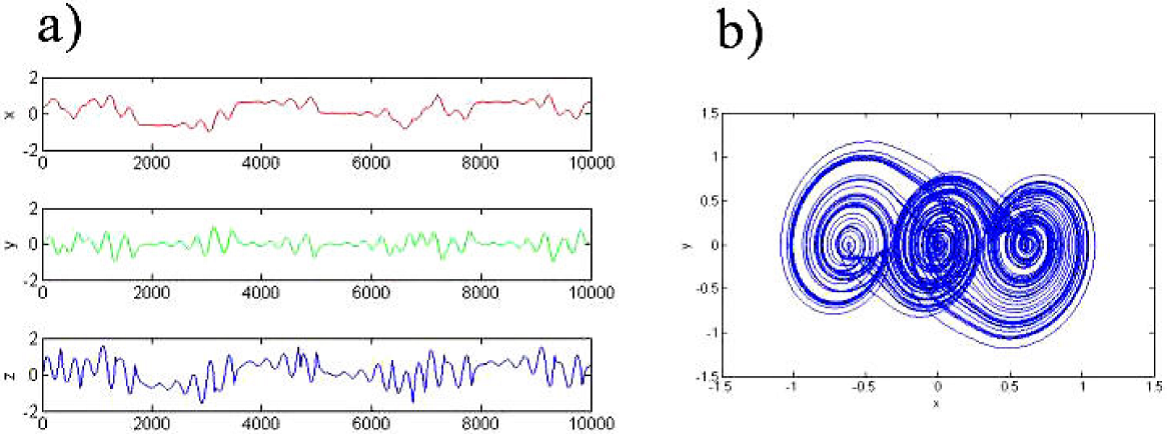 Figure 1. Two scrolls: a) states vs time, b) phase portrait X - Y