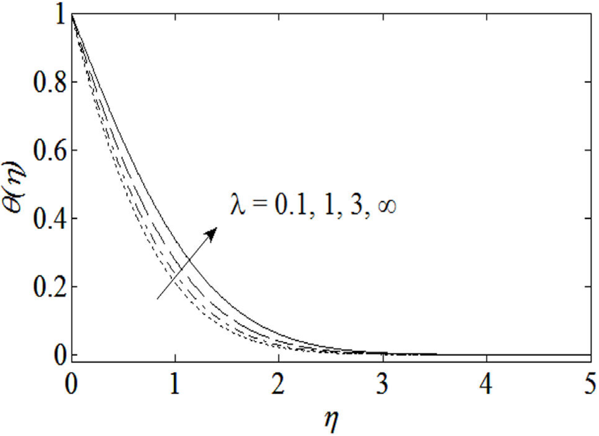 Figures 2 and 3 are displayed to analyze the behavior of slip parameter on the velocity and temperature profiles. Figure 2 depicts the dependence of f' (velocity component along x-axis) on slip parameter λ. According to this figure f' increases when slip is increased at the surface. It means that the lubricant raises the velocity of the fluid. The case when λ approaches to zero, i. e. full slip regime, the effects of viscosity are suppressed by the lubricant. Figure 3 demonstrates how the slip parameter λ affects the temperature θ. It is observed from this figure that the fluid temperature is reduced by raising the slip. This is because velocity is enhanced by increasing slip and as a result the impact of wall temperature on the flowing fluid is reduced.