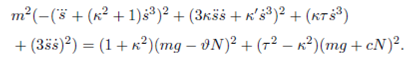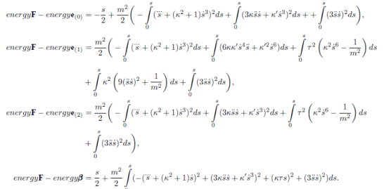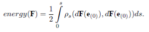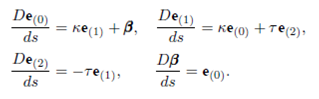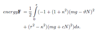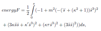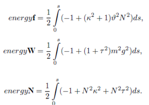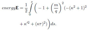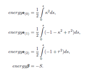 where s is the arc-length. On the appropriate length scale, bending energy provides a significant physical description of a bounding a soap film, thin wire with circular cross section, or the elastic properties of a stiff polymer. However, stiff polymers are the most interesting of them. It is used to investigate some other physical phenomena such as superconductors, vortices in fluids, mechanical properties of DNA, etc. Assuming that the curvature of space curve does not vanish, energy cost for being bent for stiff polymers is defined as