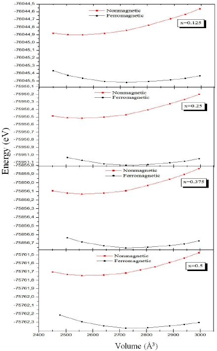 To obtain the lattice constant, the bulk modulus and its first pressure derivative which are listed in Table I, we have fitted the computed energies to the empirical Murnaghan’s equation of state 22. In this respect, the optimization of the geometrical structure parameters of Cu2 MnSi1−x Alx alloys has performed by using nonmagnetic (NM) and ferromagnetic (FM) configurations. The total energy variation, which is taken as function of volume for both non-magnetic and ferromagnetic states with different concentrations, is illustrated in Fig. 2. It can be seen that these alloys are ferromagnetic. The results for Cu2MnAl compound, which are given in Table I, agree with the experimental results 23,24 and other theoretical works 8,10,11,25. To the best of our knowledge, no comparable studies in literature on Cu2MnSi1−x Alx (x = 0.125, 0.25, 0.375, 0.5) alloys. The estimated lattice parameters (Å), from the Vegard’ slaw 26 in Eq. (1), for the selected concentrations 0.125, 0.25, 0.375, 0.5, are 5.86875, 5.8775, 5.88625 and 5.895 respectively.