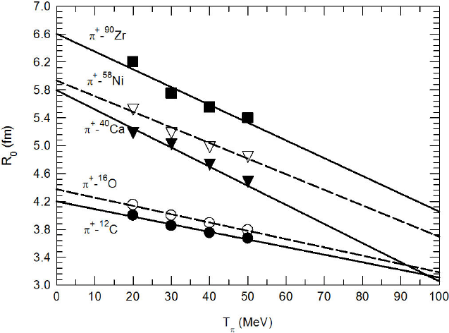 Figure 10 The R0-values versus the incident pion’s kinetic energy, Tπ (MeV) for five different target nuclei. The R0-values at 50 MeV are taken from Ref. 7. The solid and dashed lines are just to guide the eye.