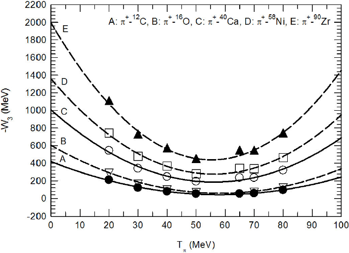 Figure 12 The W3-values versus the incident pion’s kinetic energy, Tπ (MeV) for five different target nuclei. The W3-values at 50 MeV are taken from Ref. 7 and the W3-values at energies greater than 50 MeV are extrapolated.. The solid and dashed lines are just to guide the eye.
