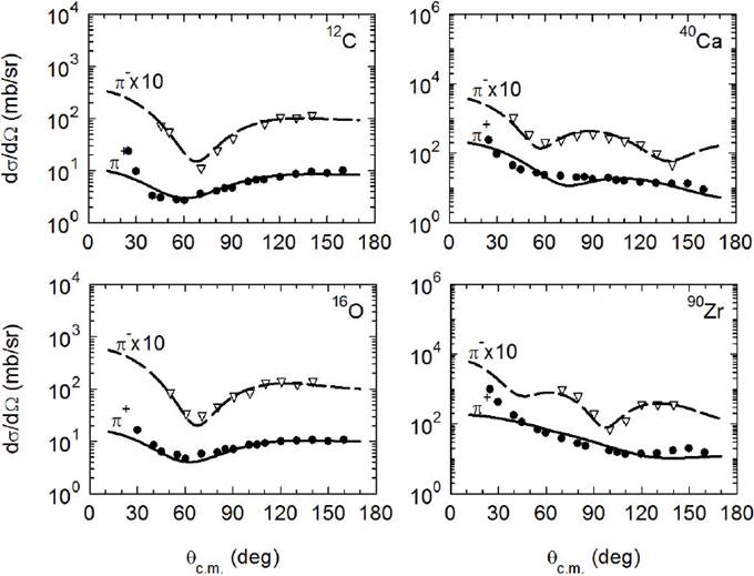 Figure 5 The calculated differential cross sections, drawn as solid and dashed lines for positive and negative pions, respectively, compared to the experimental data, represented by solid circles and empty triangles18,19, as a function of center of mass angle θc.m. for 30 MeV incident charged pions scattered off the nuclei 12C, 16O, 40Ca, and 90Zr. The calculations are made by using the scaled potentials, real and imaginary parts, drawn as solid and dashed lines in Fig. 2 for both positive and negative pions, respectively.