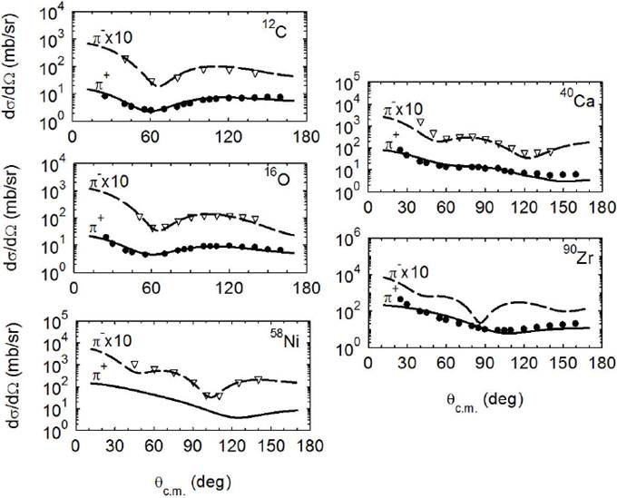 Figure 6 The calculated differential cross sections, drawn as solid and dashed lines for positive and negative pions, respectively, compared to the experimental data, represented by solid circles and empty triangles17,20,21, as a function of center of mass angle θc.m. for 40 MeV incident charged pions scattered off the nuclei 12C, 16O, 40Ca, 58Ni and 90Zr. The calculations are made by using the scaled potentials, real and imaginary parts, drawn as solid and dashed lines in Fig. 3 for both positive and negative pions, respectively.