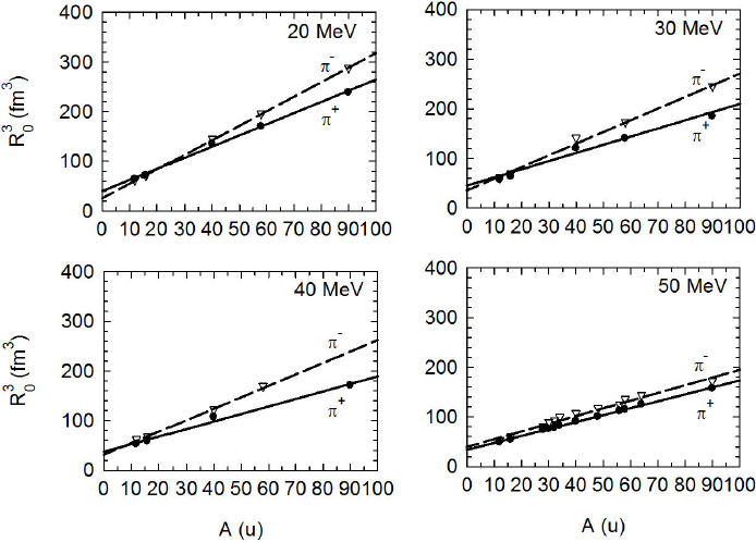 Figure 7 The cube of R0-values versus the atomic mass of the target nucleus in atomic mass units, A(u) for Tπ = 20, 30, 40 MeV and 50 MeV. The R0-values at 50 MeV are taken from Ref. 7. The solid and dashed lines, for positive and negative pions, respectively, are just to guide the eye.