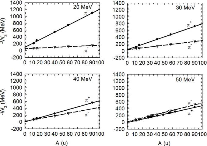 Figure 9 The W3-values versus the atomic mass of the target nucleus in atomic mass units, A(u) for Tπ = 20, 30, 40 and 50 MeV. The W3-values at 50 MeV are taken from Ref. 7. The solid and dashed lines, for positive and negative pions, respectively, are just to guide the eye.