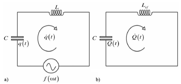 1i.Un valor VDC>0 en el circuito LC clásico se podría mantener constante de manera aparente si una inductancia 𝐿 muy grande corresponde a una frecuencia ω0 muy pequeña. Así, la carga inicial Q0 del condensador es aproximadamente constante durante un lapso temporal finito. El límite L corresponde a un circuito LC “abierto”, y por lo tanto Qt=Q0 para todo tiempo. En el circuito LC efectivo de la Fig. 2b, el valor VDC>0 se mantiene constante para todo tiempo, lo que ciertamente no se cumple en el circuito LC clásico para un intervalo temporal suficientemente grande.