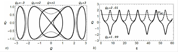 que describe a un oscilador armónico simple, como debe ser. La Ec. (21) se puede representar como un diagrama en el espacio de fases Q,Q̇ que se muestra en la Fig. 2a para el caso del campo externo fωt=2f1cosωt Apéndice B. Una característica peculiar de este tipo de diagramas es la transición súbita entre dos tipos diferentes de curvas: aquellas que oscilan en torno a Q=0 y las que oscilan en torno a Q0; la curva separatriz entre ambos tipos de curvas comprende al punto Q,Q̇=0,0 que en corresponde al valor inicial de la carga Q0=0. El “punto de bifurcación” que separa esos tipos de curvas es el valor especial de la carga inicial del condensador