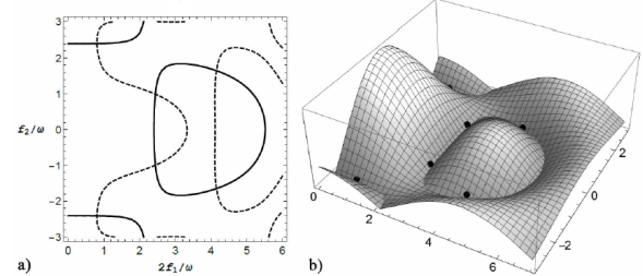 De aquí se obtienen los valores de F0 y F˜0 por evaluación numérica. En particular, se pueden calcular los valores de 2f1/ω y f2/ω tales que F0=0 y F˜0=0, como se muestra en la Fig. 3a.
