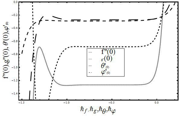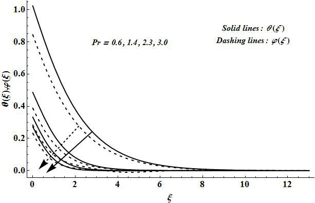 for higher Pr, and stronger for smaller Pr due to fact the profiles of θ(ξ), and φ(ξ) decay. The proper choice of Pr in manufacturing processes of industry is