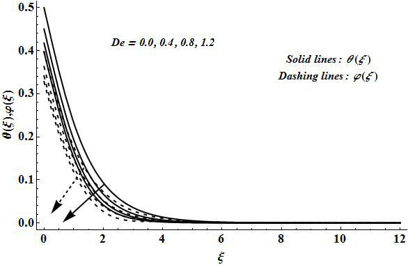 factor leads to decrement in the profiles of θ(ξ), and φ(ξ).