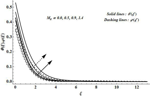 of magnetic parameter Mg on θ(ξ), and φ(ξ). This figure clearly executes that an increment in Mg give rise to the profiles of θ(ξ) and φ(ξ). Here the Lorentz force exists due to electrically conducting liquid.