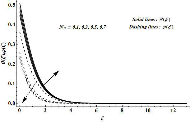 temperature θ(ξ) is boost up by an increment in NB while the curves of φ(ξ) are retarded. In fact, NB is appeared in form of (1/NB) that corresponds to weaker nanoparticle concentration. The nature of