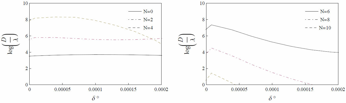 Finally, we did the same calculation, but for a very low beam width kw=10. In Fig. 5 and 6 it is shown the results for N=0,2,6,8,10 and N=1,3,5,7,9,11 in a semilog scale. In this case, we see that the behavior is, except for the case N=2 where the displacement is larger than N=0, a steadily decrease of the lateral displacement as the order of the mode of the beam increases. We see, also, that the maximum displacement occurrs at different angles for the even and odd case. For the even case, the displacement attains its maximum for angles above δ=0.001, and for the odd case, for angles below δ=0.001.