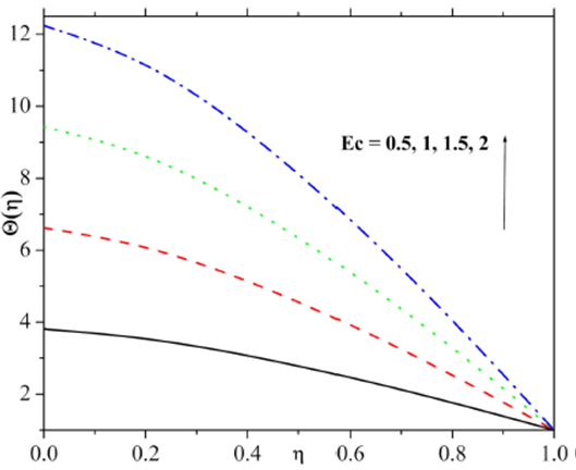 Figure 11 and 12 are displaying the nature of stretching constraint on both velocity and temperature fields. From these figures, it is observed that the velocity and temperature fields are enhanced by the increment in stretching constraint. Figure 13 disclosed the behaviour of Eckert number on temperature profile. Here thermal layer and temperature field are enhanced for larger Eckert number. This is because of the fact that viscous dissipation plays a role of the internal heat source that enhances the thermal energy and thus heats the regime. Prandtl number impact on temperature is pictured in Fig. 14. Temperature is decreased significantly with the use of larger Prandtl number.