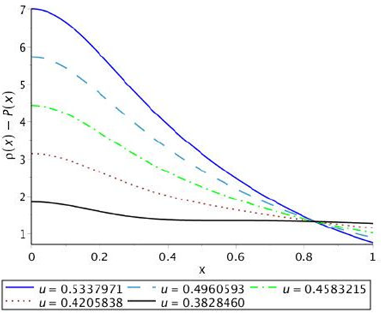 Figure 3 Pressure for different values of compactness u with a fixed value of w = 0:13828732.