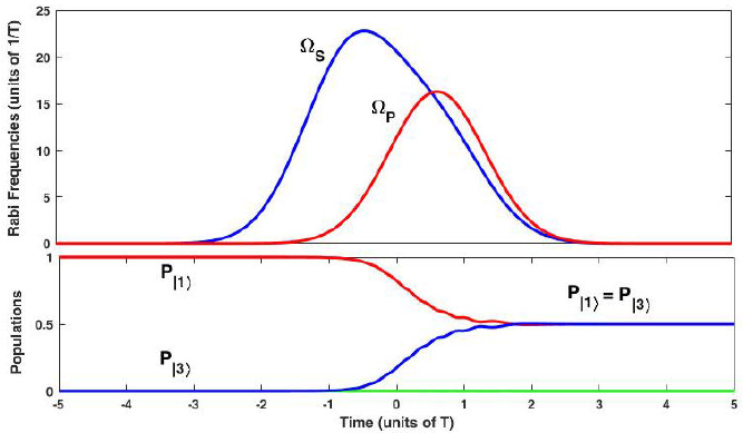 where β is a mixing angle. Without loss of generality, we assume that the coupling strengths ΩP,S are real and positive. We use three equal-amplitude Gaussian pulses, a pump pulse and two Stokes pulses first with the same time dependence as the pump pulse and latter coming earlier as follows [29]: