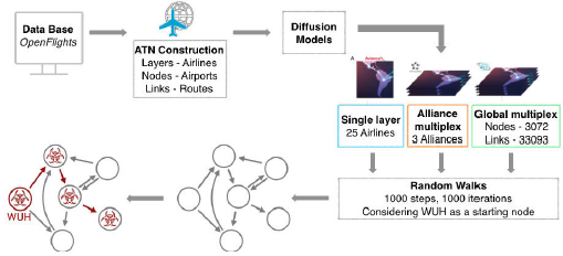 Once the networks were created, we simulated the virus propagation phenomenon with a model of random walks with a probability p= 1 of contagion, i.e., if passed at least once through an arbitrary airport, this one would be considered infected.