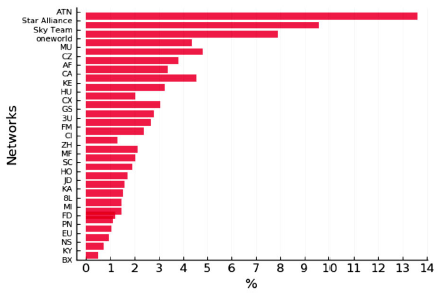 On the vertical axis of Fig. 4, the 29 networks studied are shown, from the least amount of airports in a network, corresponding to BX, to the network containing the largest amount of airports, which is the ATN with 3072 airports and 33093 routes.