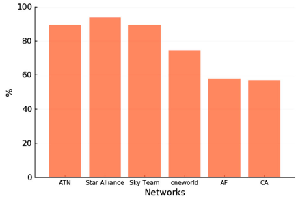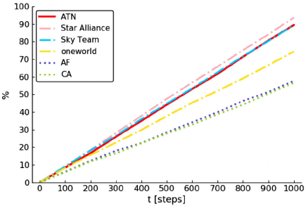 The simulations resulted in a collection of 1000 random walks starting in Wuhan, China. With these simulations, we found that the overall infected portion of the ATN after approximately one year is 13.62%. The ATN’s infected area by the COVID-19, if only traveled through a single airline or or alliance is also shown in Fig. 4, where the percentage is detailed by network.