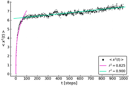 This irregular movement or Brownian motion modeled by the random walk considers the mean square displacement. As stated by Frenkel et al.13, considering an ensemble average, over the trajectories of N particles, the mean square displacement at a time t is defined as: