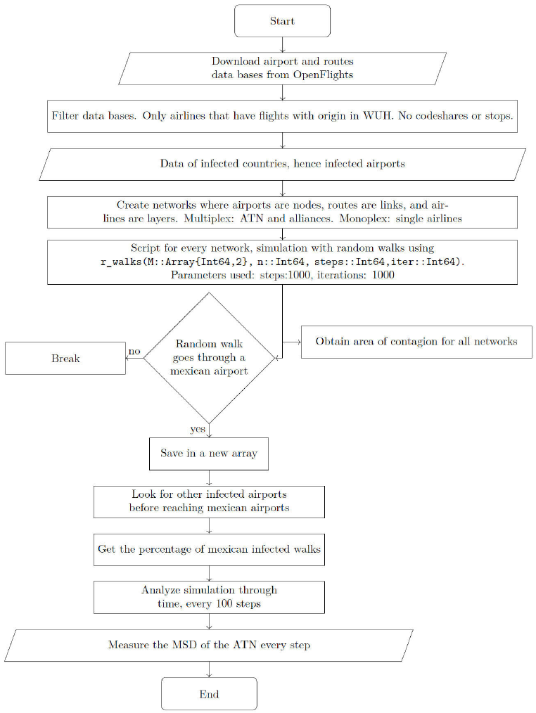 The random walk model we used is very simple and works as a first approach to the problem, taking Wuhan as an only starting point (not from other infected countries) and its trajectory. First of all we are just analyzing possible contagions through the Air Tranportation Network, we are not considering other ways of transmission (layers of the multiplex) like the maritime or terrestrial networks. We also do not consider groups of susceptible, infected, and recovered people as in a SIR model 11, 18 hence our model is not sensible enough to many situations or changes as other more robust models. Nevertheless, we were able to capture a high risk of infection in Mexico which is what we are in fact witnessing.