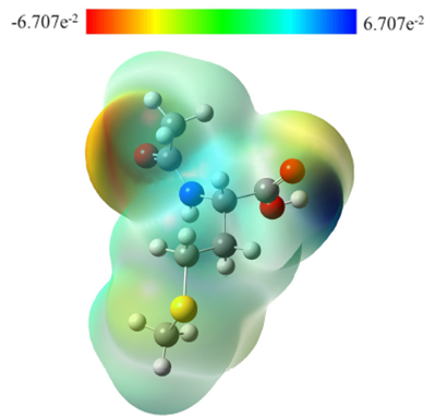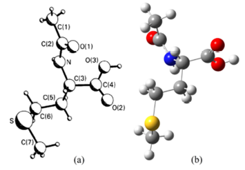 All amino acids (except glycine) can exist in two isomeric forms, which are called D-(dextrorotatory) and L-(levorotatory) forms, analogous to left-handed and right-handed configurations, because of forming two different enantiomers (also called enantiomers stereoisomers and optical isomers which are mirror images to each other) around the central α-carbon atom. Methionine is one of the essential sulfur-containing amino acids, and it occurs naturally as L-methionine. A racemic DL- methionine mixture that is composed of equal amounts of D-methionine and L-methionine forms of the same compound is not optically active. Synthetic animal feed grade DL-methionine is a white crystalline powder with a faint characteristic odor and sweet, slightly bitter taste 1. N-Acetyl DL-methionine (NAM) is one of the derivatives of DL-methionine, and, in this content, density functional theory investigations were performed on the structural, electronic, and spectroscopic properties of NAM molecule.