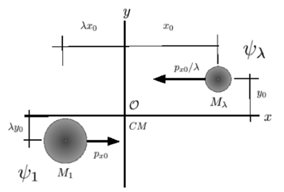 Figure 1 Scheme of the initial conditions on the xy-plane, for the two configurations described by ψ1 and ψλ. It illustrates the initial position and momentum in terms of the mass ratio λ, which are defined such that the center of mass is located at the origin and is expected to remain there.