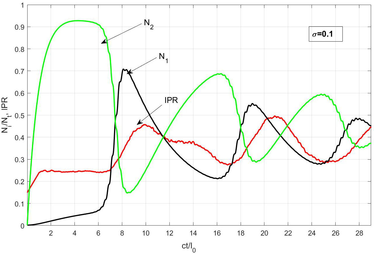 FIGURE 2 (Color online) Dynamics of the population of lasing levels N 1,2 (green and black lines respectively) and the IPR (red line) as functions of time for σ =0.1. We observe that the IPR has periodical fluctuations (maximal values) related to the field localization in times t =10,21 and 29.